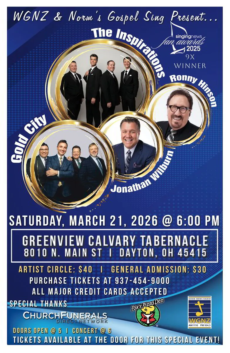 Welcome to WGNZ – Dayton’s Good News Station! Broadcasting on 1110 AM and 104.3 FM, we’ve been uplifting the Miami Valley and Greater Dayton area with 24/7 Southern Gospel music, inspiring Christian teaching, and positive community programming since 1979. Locally owned and operated, our mission is to spread hope, encouragement, and good news through great music and heartfelt messages — whether you’re tuning in on the radio, streaming live online, or listening on your mobile device. Join us as we celebrate faith, family, and community with every song and story we share.
